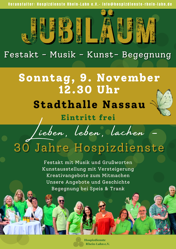 Exakt vor 30 Jahren, am 9. November 1995, wurde in Bad Ems die Gründung der ambulanten Hospizdienste Rhein-Lahn e.V. beschlossen. Ein Tag der Freude, den wir feierlich und groß begehen möchten. In der Stadthalle Nassau feiern wir deshalb mit einem großen Benefizkonzert und lassen nicht nur diese großartigen 30 Jahre, sondern auch die Veranstaltungen unseres Jubiläumsjahres Revue passieren.
